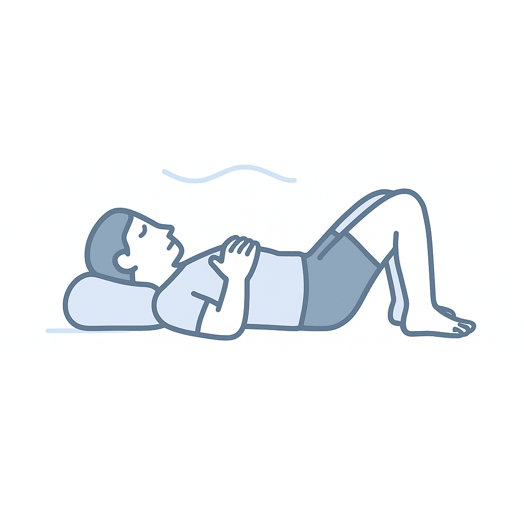 Læg dig på ryggen med bøjede ben og fødderne i gulvet. Placer en hånd på maven og én på brystet. På indåndingen mærker du maven løfte sig en smule, på udåndingen giver du langsomt slip i kæber, skuldre og hofter. Det handler ikke om at yde, men om at lade kroppen mærke tyngde og støtte.