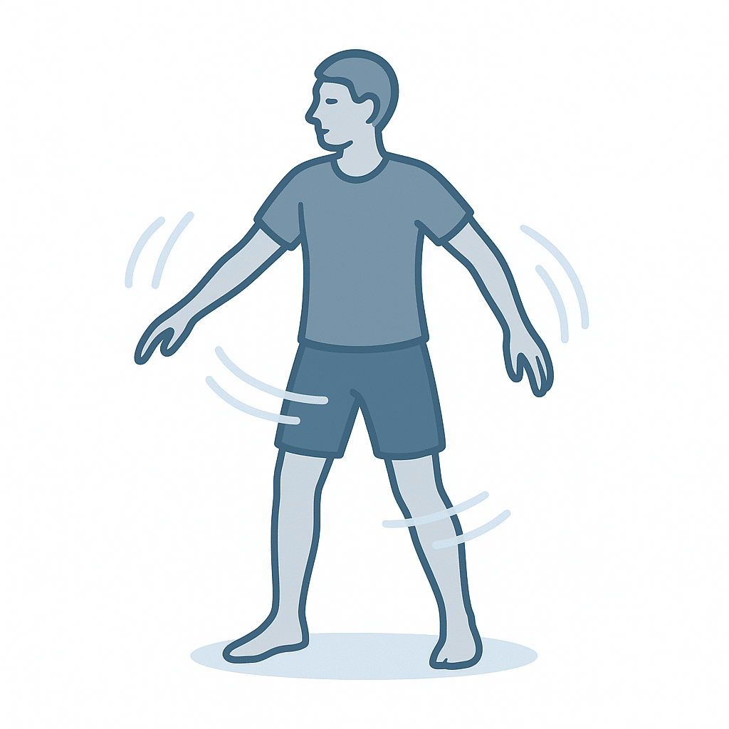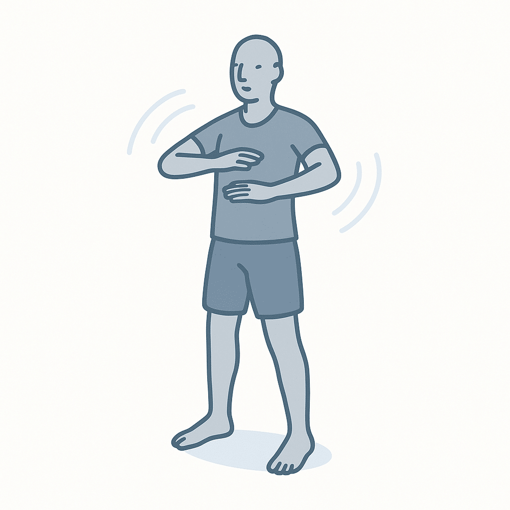 Stå med fødderne i hoftebredde. Lad armene hænge afslappet, og begynd med langsomme rotationer i overkroppen, så armene svinger let fra side til side. Tænk mere “blødt sving” end træningsøvelse. Fokus er på at løsne brystkasse og øvre ryg, så hjertet ikke føles låst inde i en stiv “boks”.